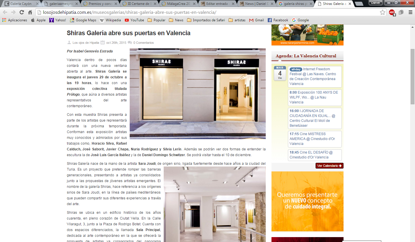 Tengo el placer de formar parte de la selección de representantes del Festival de las Artes de Valencia Ciutat Vella Oberta en la Casa de Velázquez en Madrid. Será una exposición colectiva en la que estaré acompañado de artistas como Roberto López, Ana Chacón, Fernando Jiménez, Lorena García Mateu, Nuria Rodrigez, Marigela Pueyrredon, Enrique Estelles, Nestor López, Regina Quesada, Azucena Abril Alonso, Julia Juaniz, Víctos de Vicente, Gerardo Stübing, Elena Martí, José Luis García Ibañez, Samuel Bayarri, Rafaela Pareja, Alberto Santoja, Ana Ruiz Sospedra, Reme Tomas, Manuel Martí Moreno y Elena Sánchez.