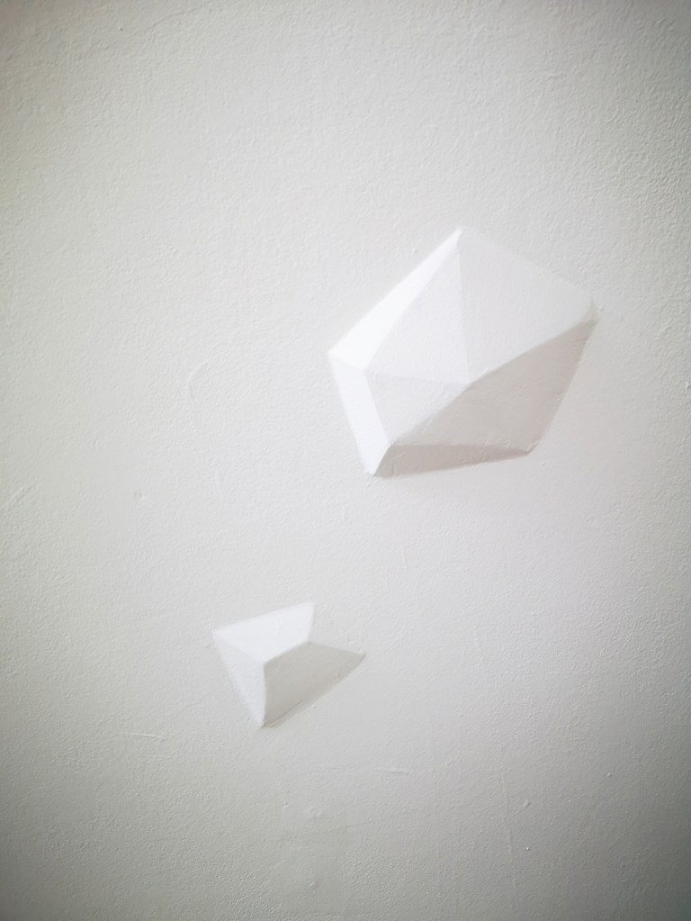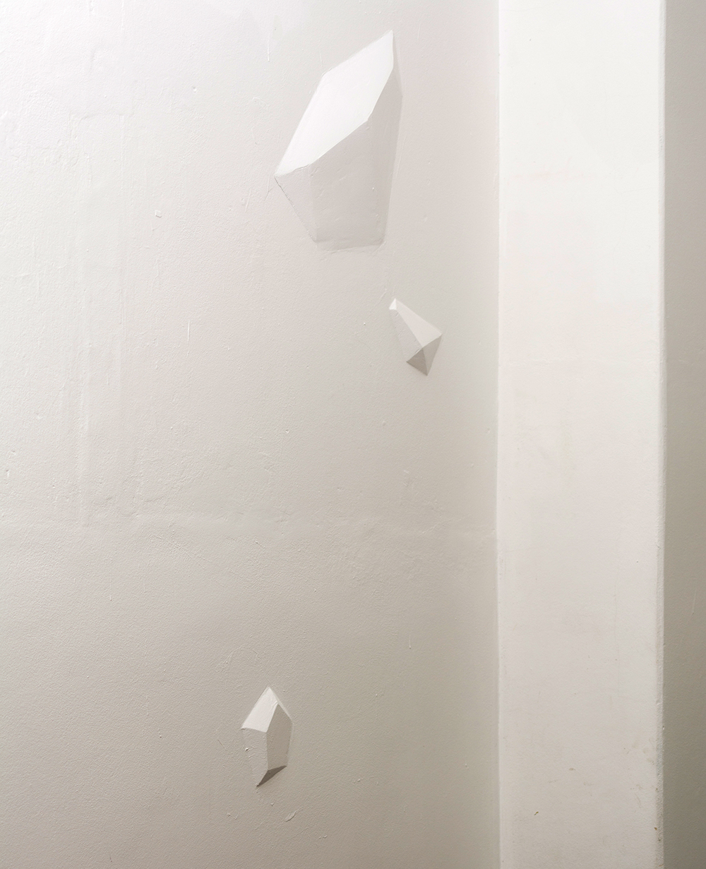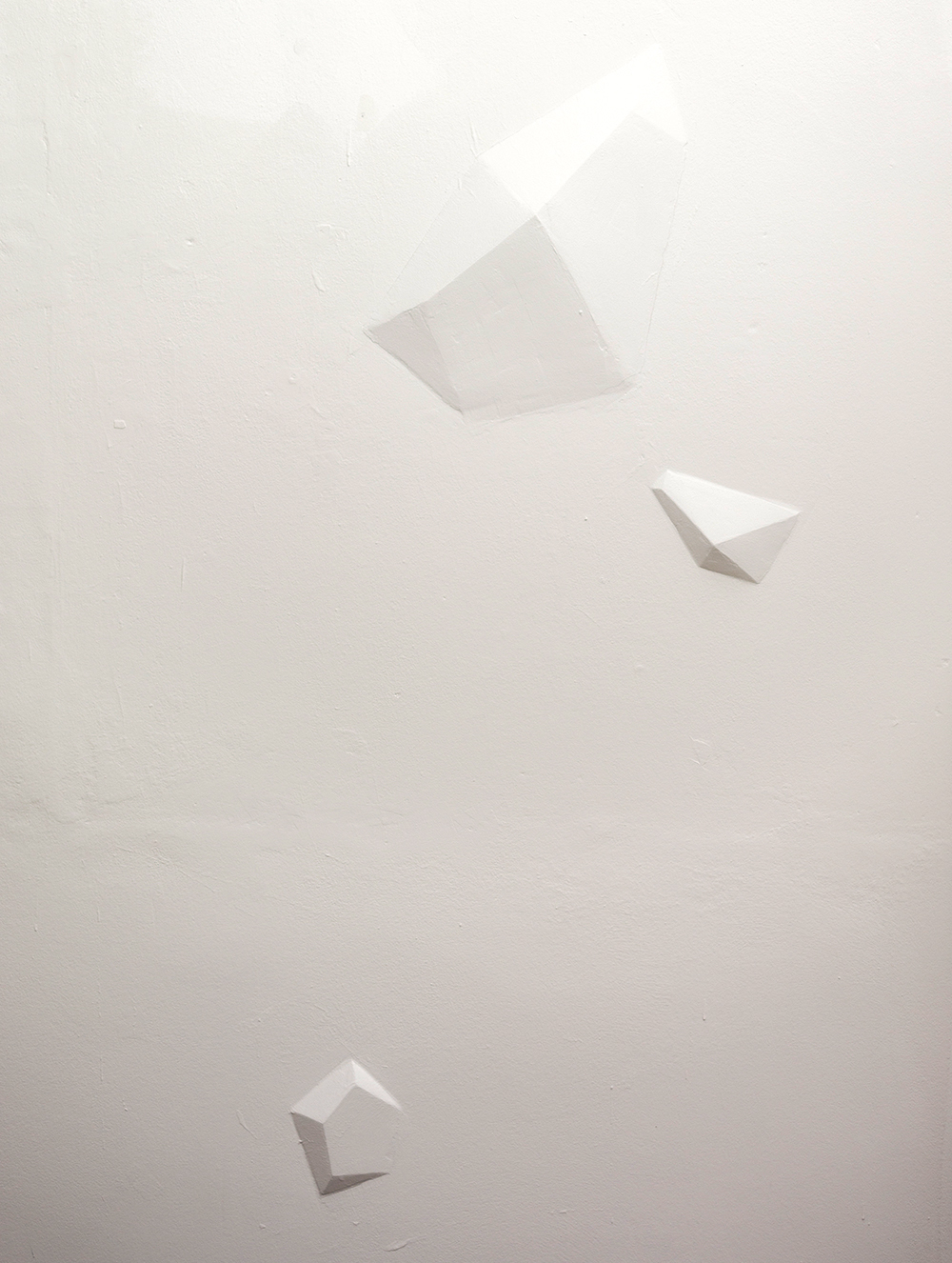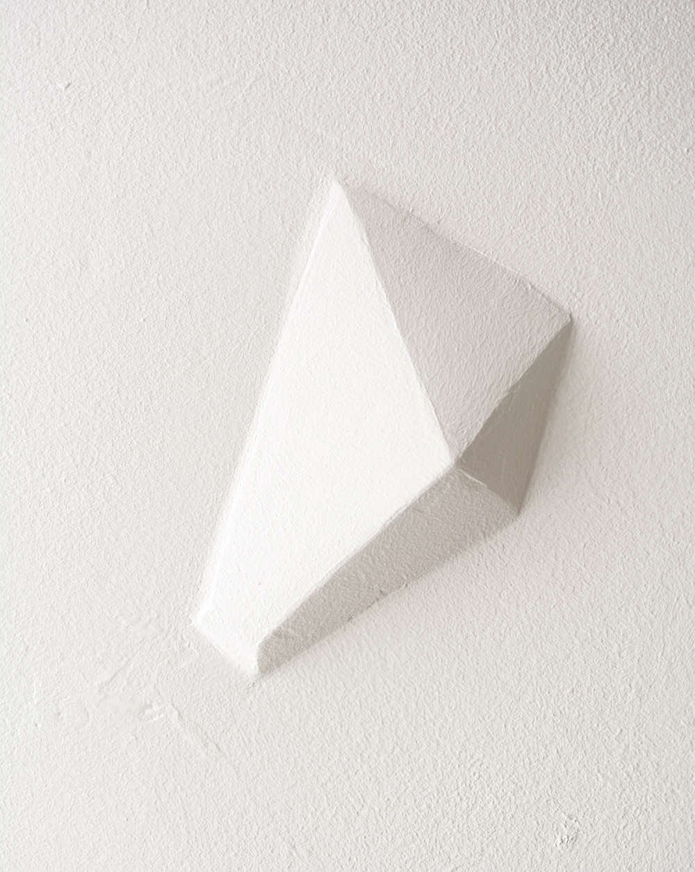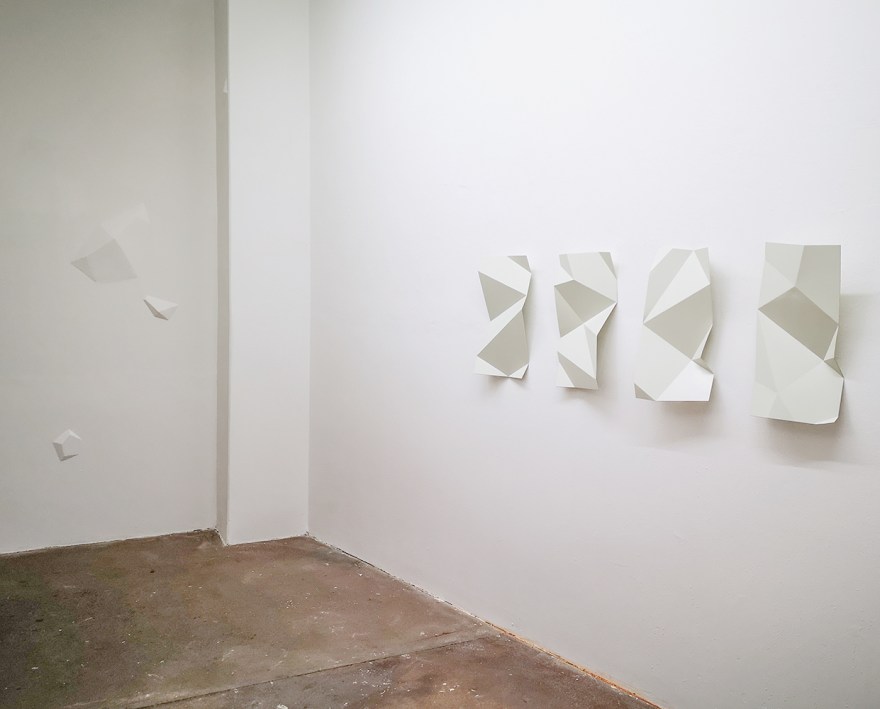 Pensar en el espacio como algo que emana del cuerpo, como experiencia sensorial y, mediante un objeto, incidir en dicha experiencia. Tomar una pequeña superficie y desplazarla ligeramente, distorsionando el espacio normativo a partir de una acción mínima. Sintetizar la abstracción del espacio en un lenguaje elemental, donde los objetos son poco más que una distorsión de la pared. La distorsión de un plano que debería ser recto. La distorsión de la experiencia del cuerpo en el espacio expositivo.