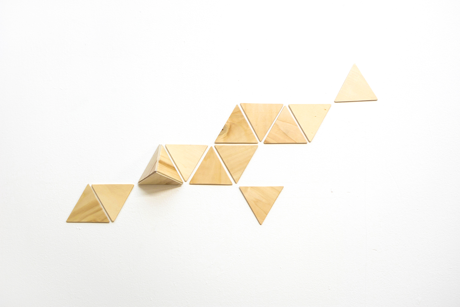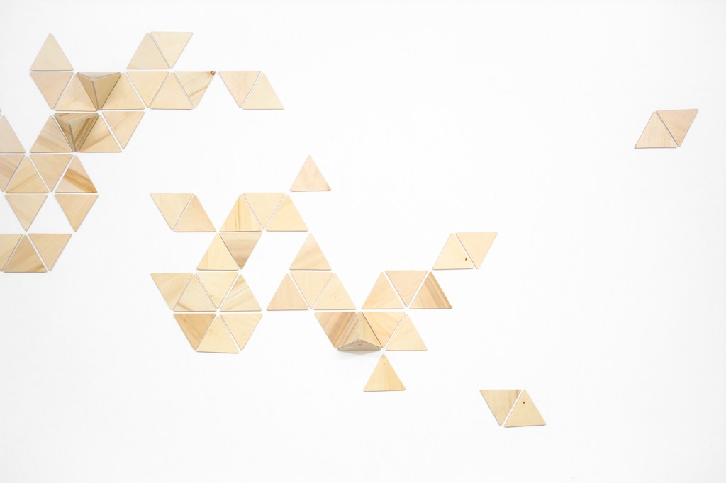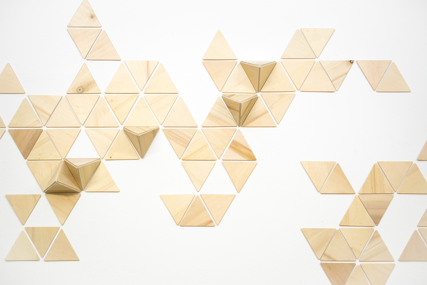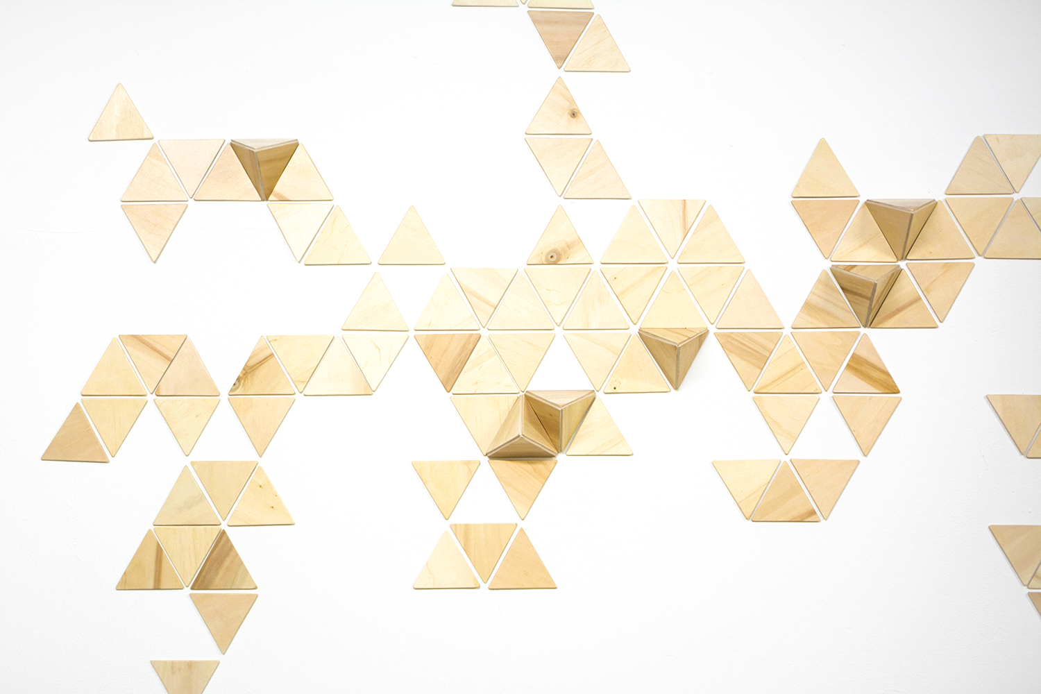 Simplex es obra de pared compuesta por 154 triángulos equiláteros y 12 tetraedros que, en cada montaje, genera una composición única, adecuada a la pared y al lugar. Por tanto, la obra funciona como una instalación que “re-configura el espacio» en cada ocasión, dando lugar siempre a formas y composiciones diferentes pero partiendo del mismo elemento base. Es como recomponer las letras de un alfabeto que, en función del orden, construyen significados diferentes. En este caso se trata de recomponer el espacio atendiendo a las especificidades de su propio lenguaje.