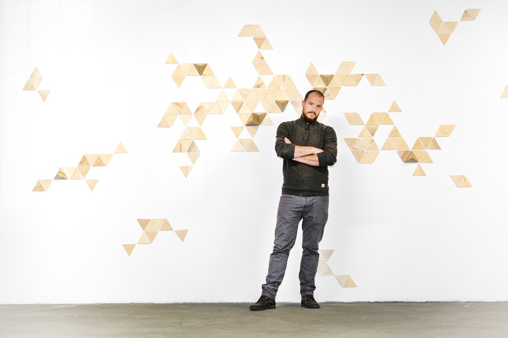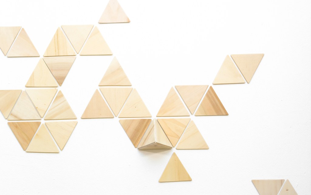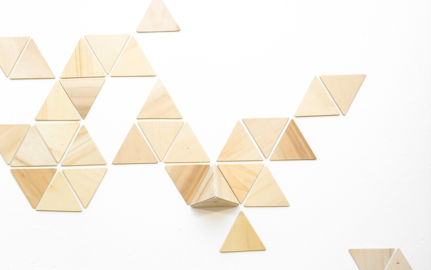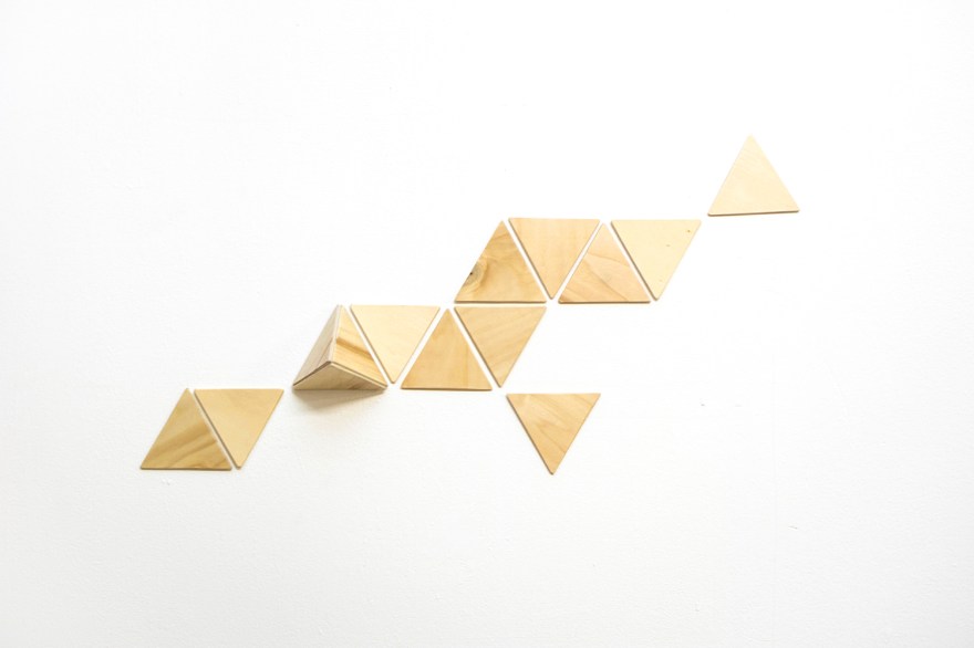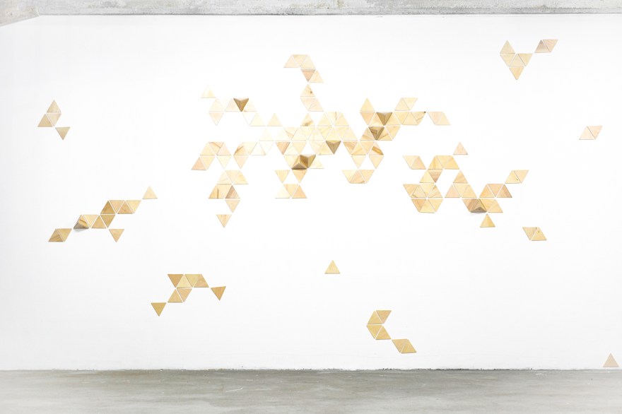Simplex es obra de pared compuesta por 154 triángulos equiláteros y 12 tetraedros que, en cada montaje, genera una composición única, adecuada a la pared y al lugar. Por tanto, la obra funciona como una instalación que “re-configura el espacio» en cada ocasión, dando lugar siempre a formas y composiciones diferentes pero partiendo del mismo elemento base. Es como recomponer las letras de un alfabeto que, en función del orden, construyen significados diferentes. En este caso se trata de recomponer el espacio atendiendo a las especificidades de su propio lenguaje.